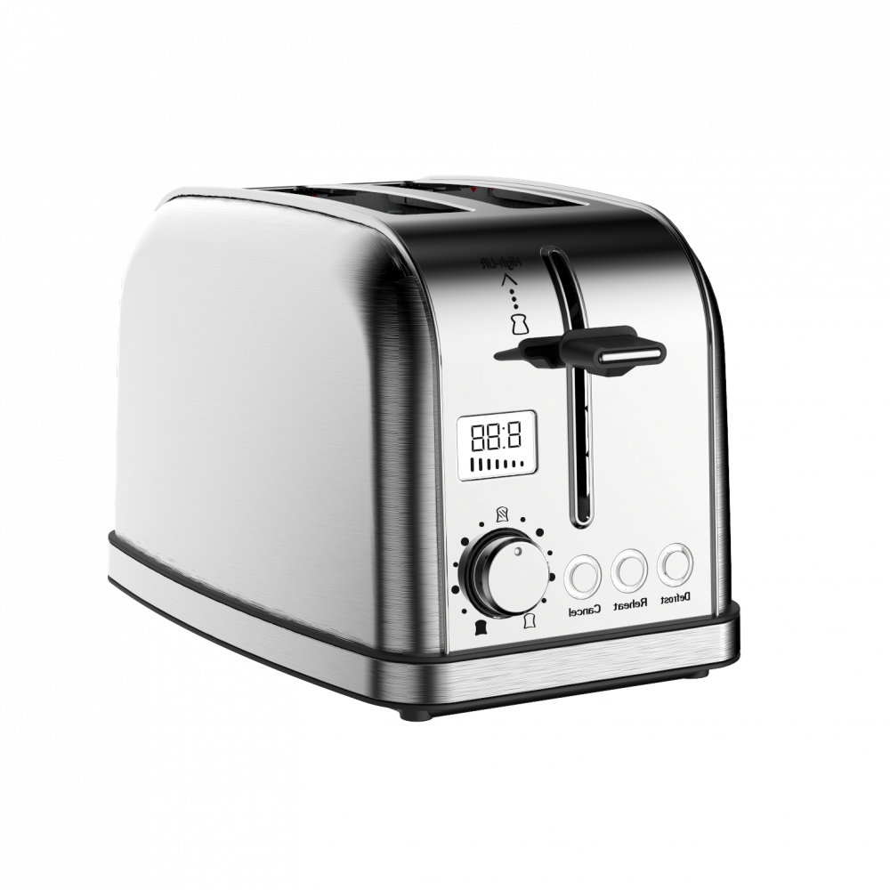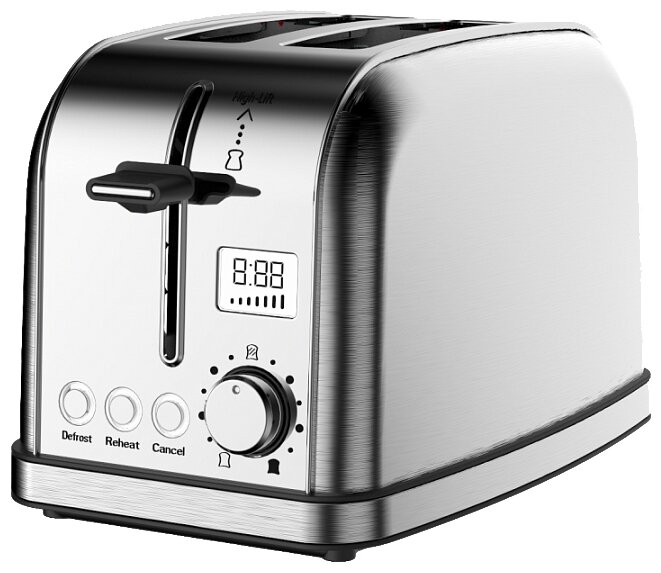на 2 тоста; мощность 950 Вт; механическое управление; функция размораживания; ненагревающийся корпус; дисплей; металлический прочный корпус; поддон для крошек