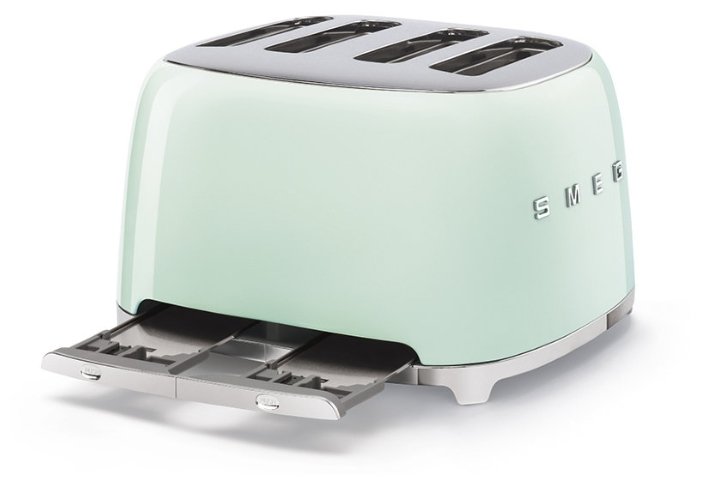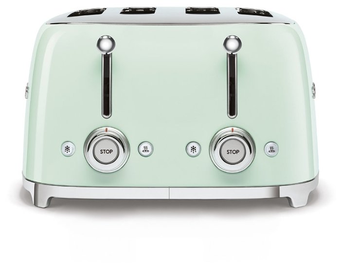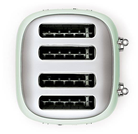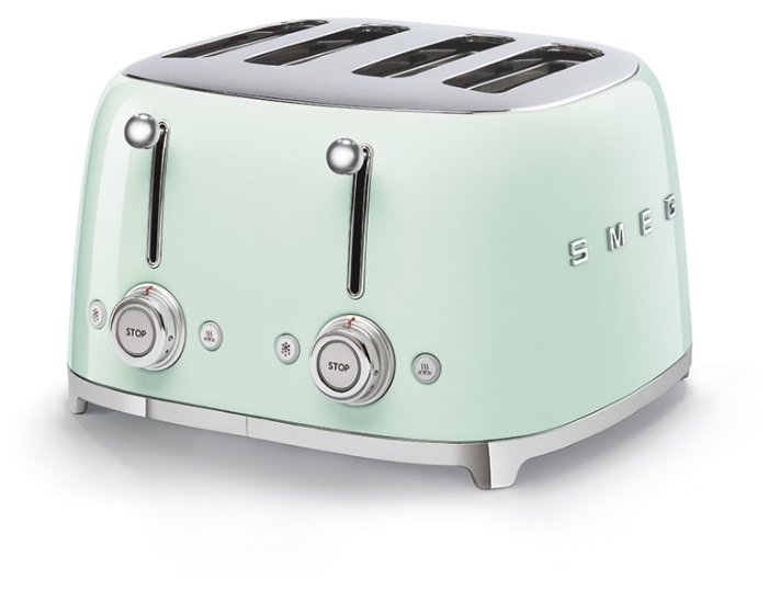 Тостеры SMEG/ Тостер на 4 ломтика, Цвет пастельный зеленый; Функции: подогрев, размораживание, багель; 6 уровней поджаривания; Съемный поддон для крошек.