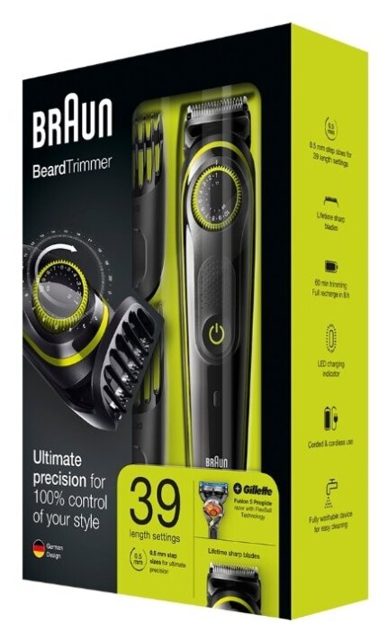 для бороды и усов; материал лезвий: нержавеющая сталь; влажная очистка; минимальная длина стрижки: 1 мм; максимальная длина стрижки: 20 мм; число установок длины: 39; питание: автономное/от сети; время работы от аккумулятора: до 60 мин