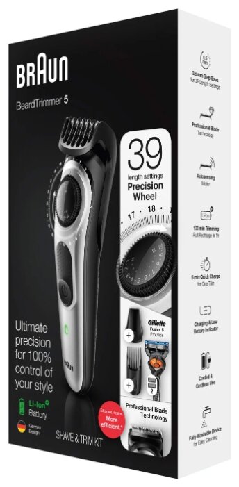 - Дополнительная информация: гребень 1 - 10 мм; гребень 11 - 20 мм; детальный триммер; щеточка для чистки; бритва Gillette Fusion