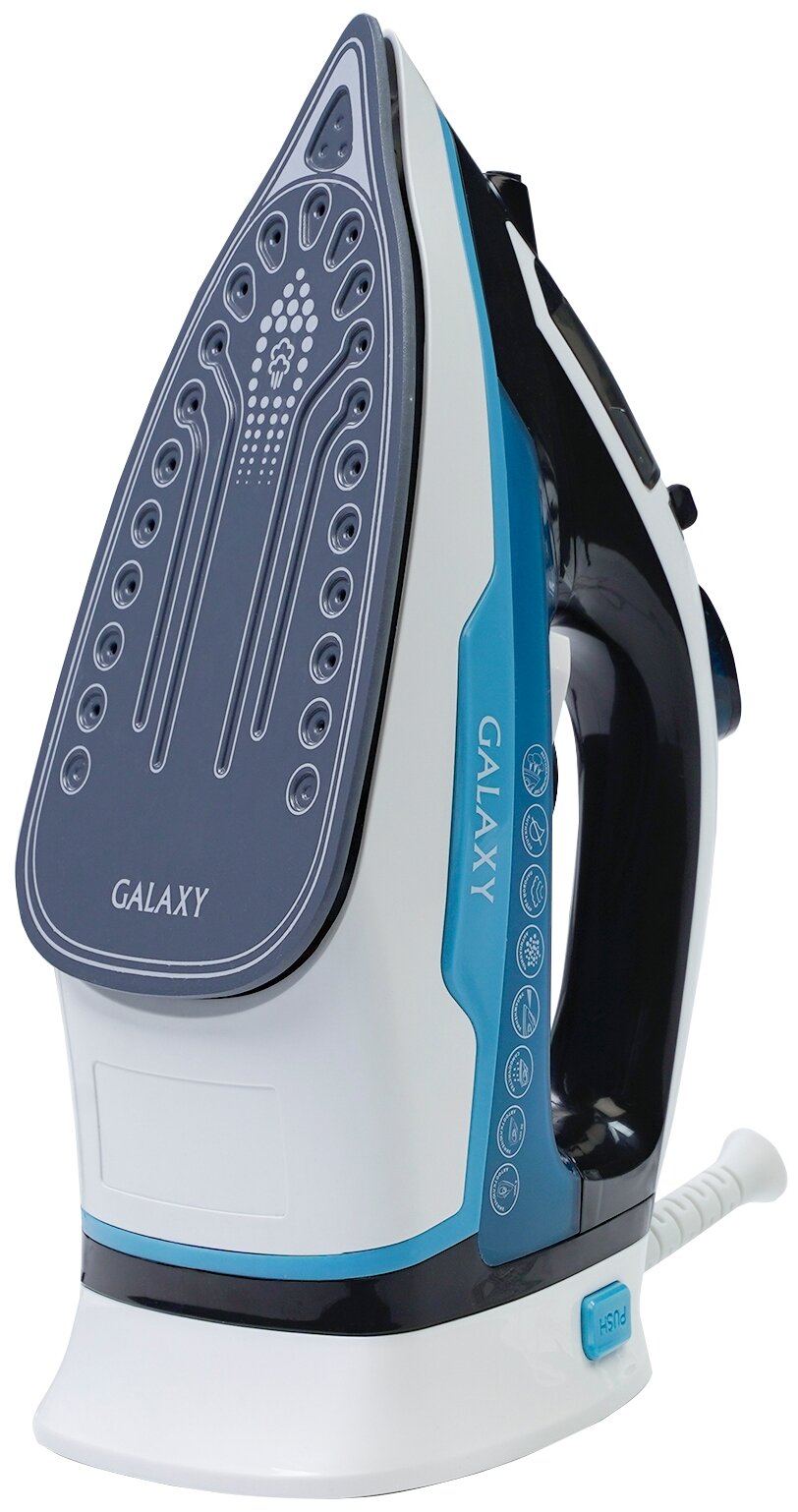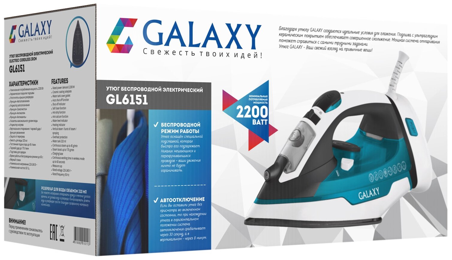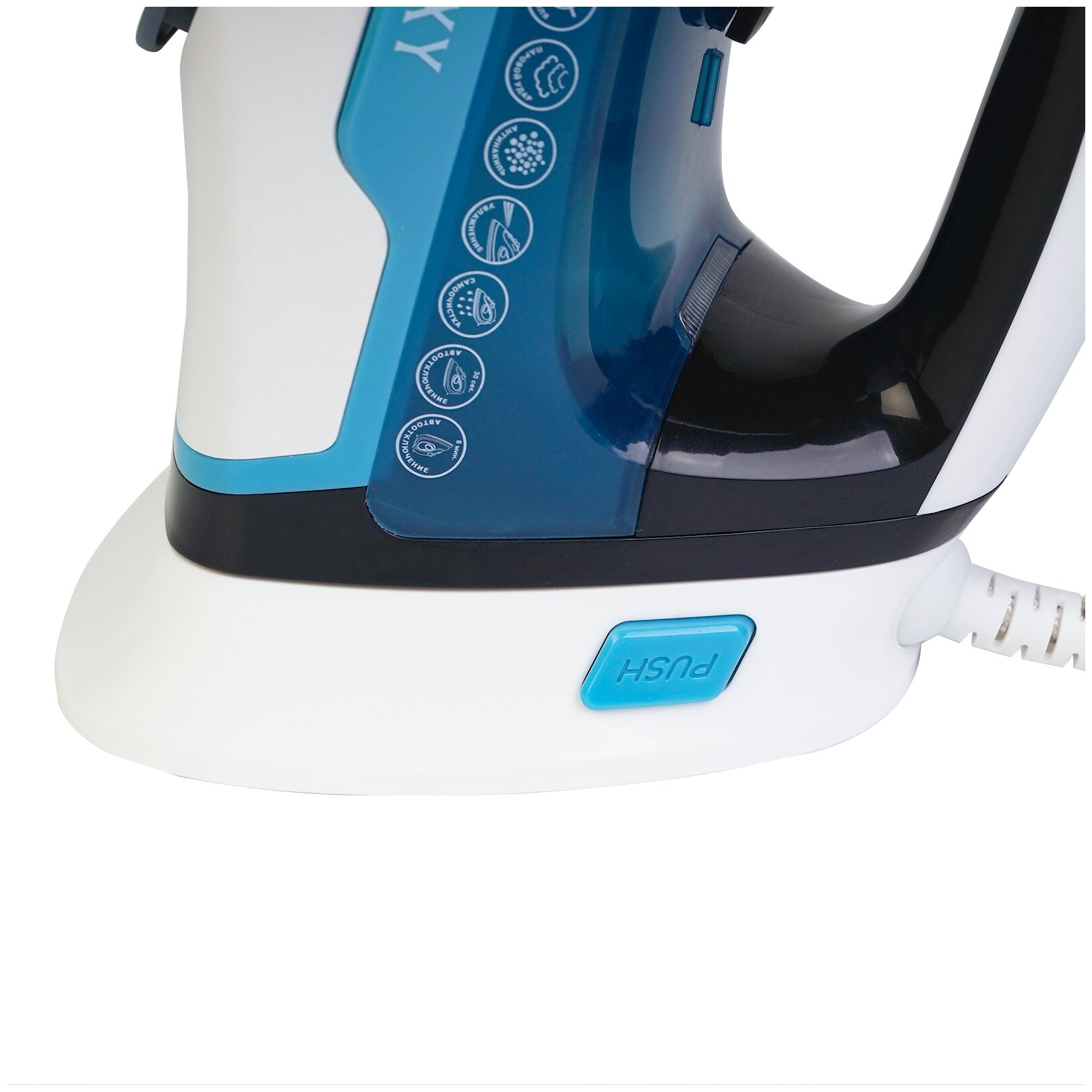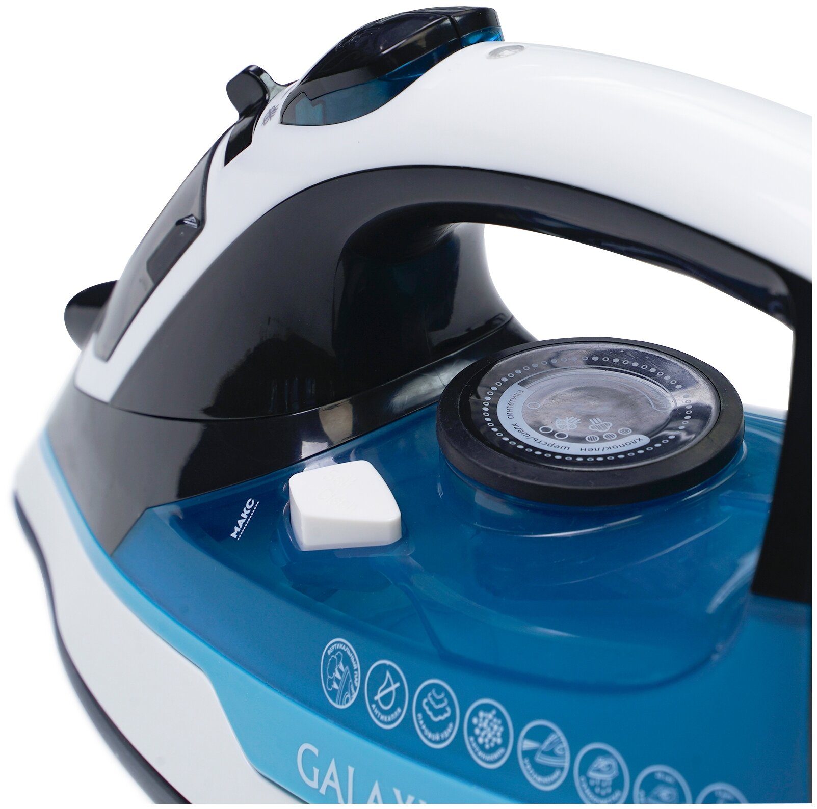 мощность: 2200 Вт; материал подошвы: керамика; постоянный пар: 45 г/мин; паровой удар: 170 г/мин; вертикальное отпаривание; функция разбрызгивания; автоматическое отключение; противокапельная система; беспроводное использование