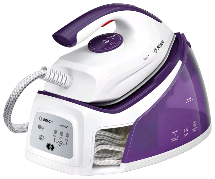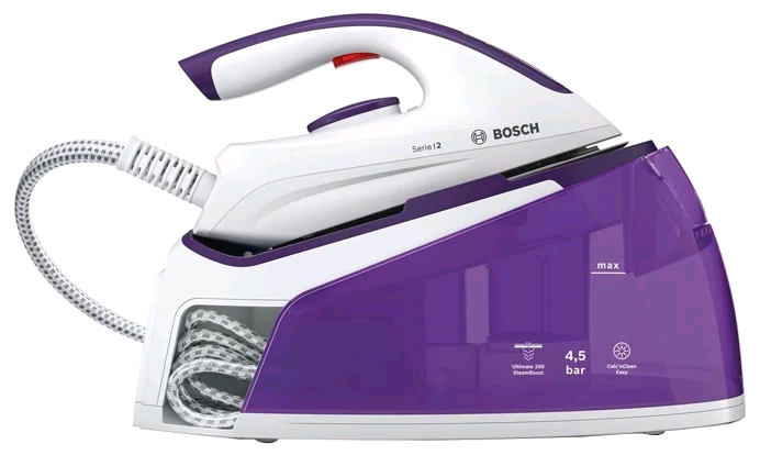 мощность: 2400 Вт; максимальное давление: 4.5 бар; постоянный пар: 110 г/мин; паровой удар: 240 г/мин; вертикальное отпаривание; автоматическое отключение; функции: защита от накипи, паровой удар, постоянная подача пара; материал подошвы: керамика; вес: 3 кг