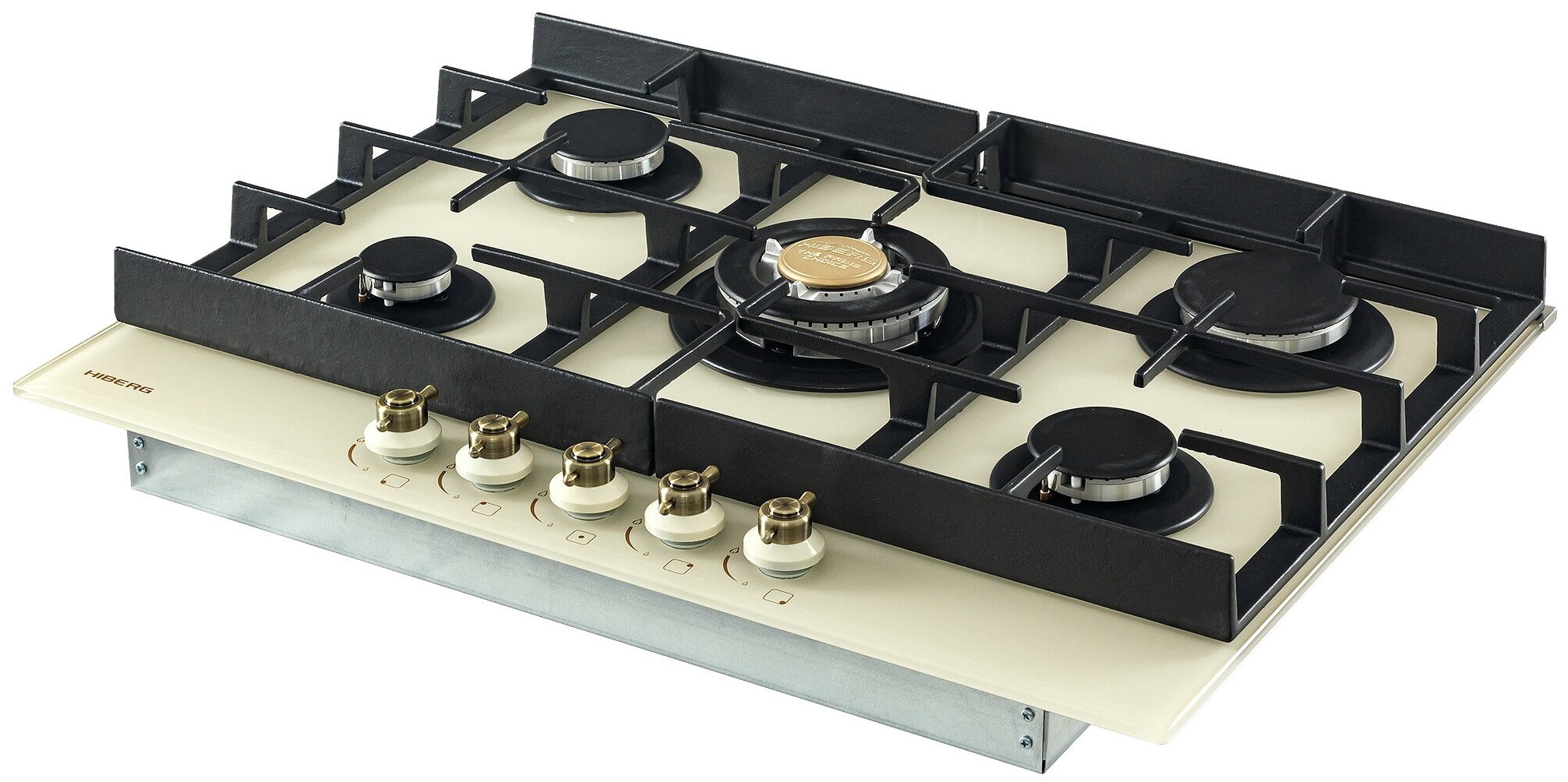 материал панели: закаленное стекло; общее количество конфорок: 5; установка: независимая; электроподжиг: есть; газ-контроль: есть; чугунные решетки: есть; переключатели: поворотные; ШхГ: 68.40х51 см