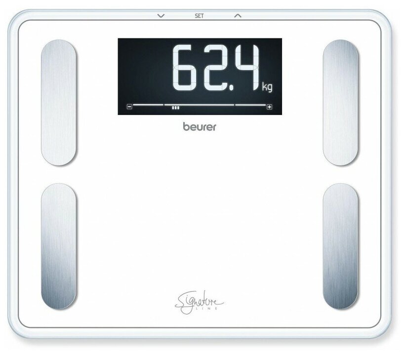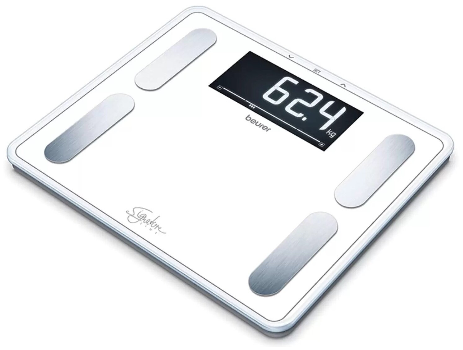 тип устройства: весы, тип весов: электронные, дополнительные функции: определение доли жировой ткани, определение доли мышечной ткани, определение доли воды, определение доли костной ткани, расчет ИМТ (BMI), память, диагностические, максимальная нагрузка: 200 кг, тип элементов питания: AAA, точность измерения: 100 г