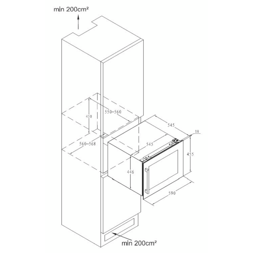 Количество зон одна Температурный режим +5..+20 °C Количество бутылок 28 шт. Условие эксплуатации +10..+38 °C Возможность встроить да, только в колонну Хладагент R600a Охлаждение динамическое Вид охлаждения компрессорное Дверь стеклянная с защитой от УФ Полки деревянные Подсветка LED, белая Объем 65 л. Внутренняя влажность 30-70 % (через емкость с водой) Потребляемая мощность 65 Вт Энергопотребление в сутки 0,37 кВт Энергетический класс G (по таблице классов 2021 г.) Номинальное напряжение 220 В, 50 Гц Корпус черный металлический Разморозка автоматическая Угольный фильтр нет Зимний режим есть Перевеска двери есть Замок нет Управление сенсорное Уровень шума 40 дБ Размеры (ШхГхВ) 590х563х455 мм Масса (без упк./в упк.) 27/30 кг Размеры ниши (ШхГхВ) 560х550х450 мм Размер в упаковке (ШхГхВ) 650х650х515 мм