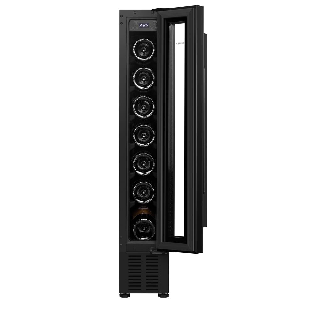 Тип установки/монтажа Отдельностоящий; Возможность встраивания Да; Полезный объём, л 20; Макс. кол-во бутылок, шт. 7; Индикация открытой двери Нет; Термостат Электронный; Индикация температуры Да; Индикация включения Нет; Диапазон температуры, °C 5-20; Диапазон влажности, % 50-80; Вентилятор для распределения температуры Да; Звуковой сигнал отключения питания Да; Звуковой сигнал повышения температуры Да; Тип управления Сенсорное; Количество компрессоров 1; Энергопотребление, кВтч/год 144; Класс энергетической эффективности G; Материал корпуса Металл; Количество камер 1; Освещение холодильной камеры Да; Тип освещения Светодиодное; Тип компрессора Стандартный; Тип охлаждения Компрессорный; Количество полок Без полок; Внешнее покрытие двери Стекло; Хладагент R600a; Климатический класс SN/N/ST; Ширина, мм 150; Глубина, мм 568; Высота, мм 870; Цвет Черный; Вес товара без упаковки (нетто), кг 18,54