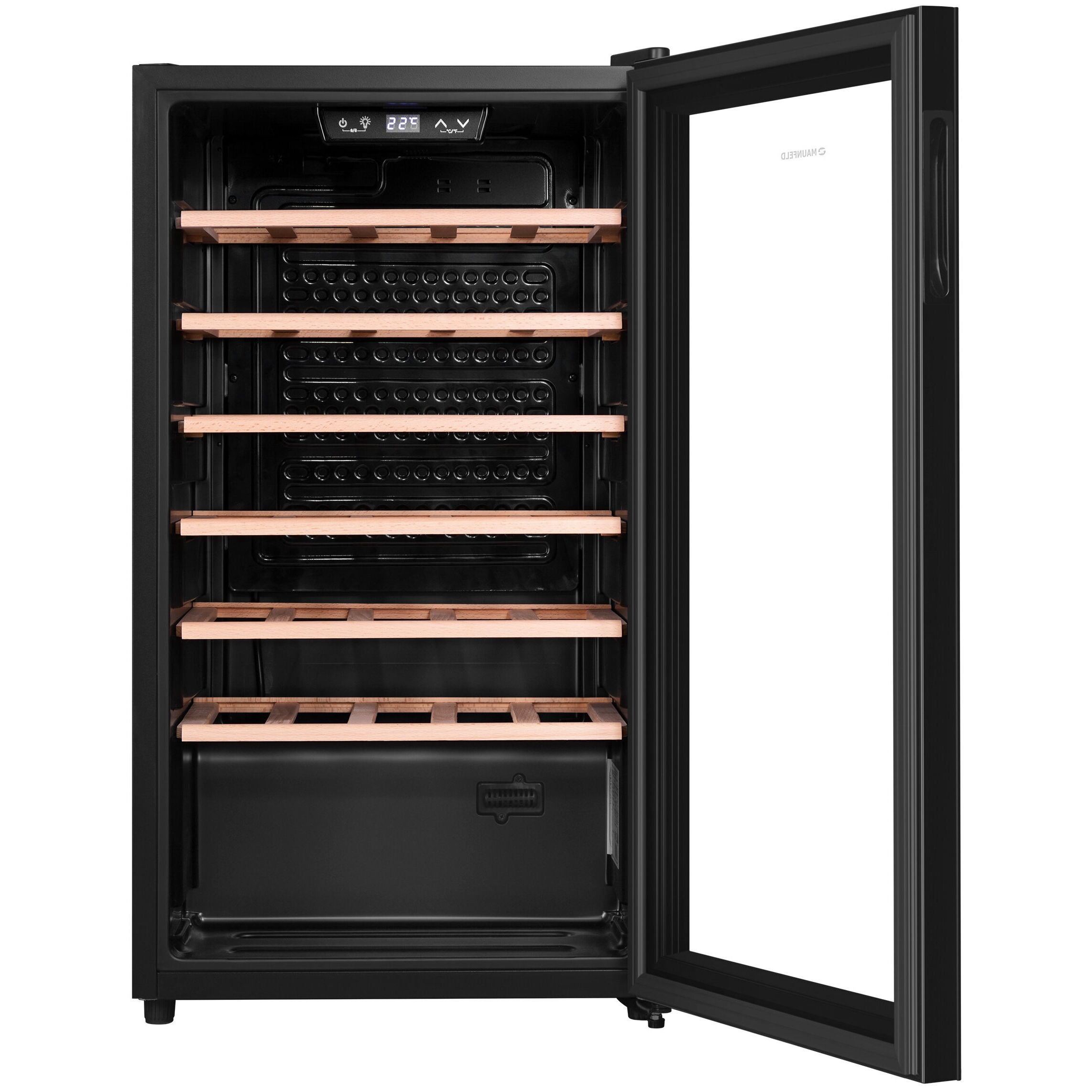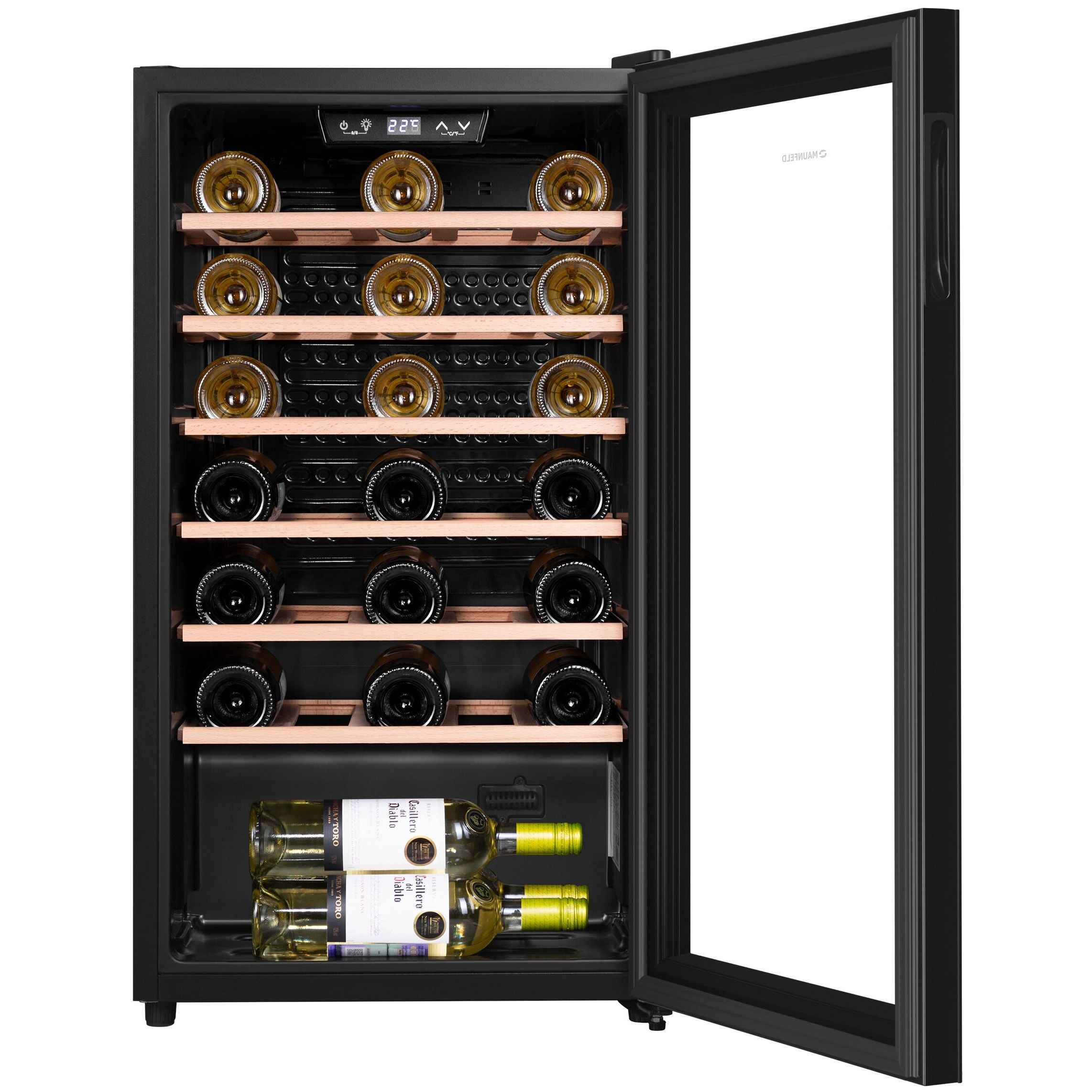 Основные характеристики: Тип винного шкафа: монотемпературный: Тип управления: электронное: Класс энергопотребления: G: Энергопотребление: 139 кВтч/год: Климатический класс: N, SN, ST: Количество камер: 1: Количество дверей: 1: Общий объем: 85 л: Емкость винного шкафа, бут.: 34: Конструкция: Количество компрессоров: 1: Особенности: перевешиваемые двери, дисплей: Стеклянные двери: есть: Материал полок: дерево: Габариты и вес: Вес: 26.68 кг: Высота: 87.5 см: Ширина: 48 см: Глубина: 43 см: Дополнительные характеристики: Дополнительные функции: индикация температуры, защита от детей: Уровень шума: 40 дБ: Хладагент: R600a (изобутан): Цвет корпуса: чёрный;;;;