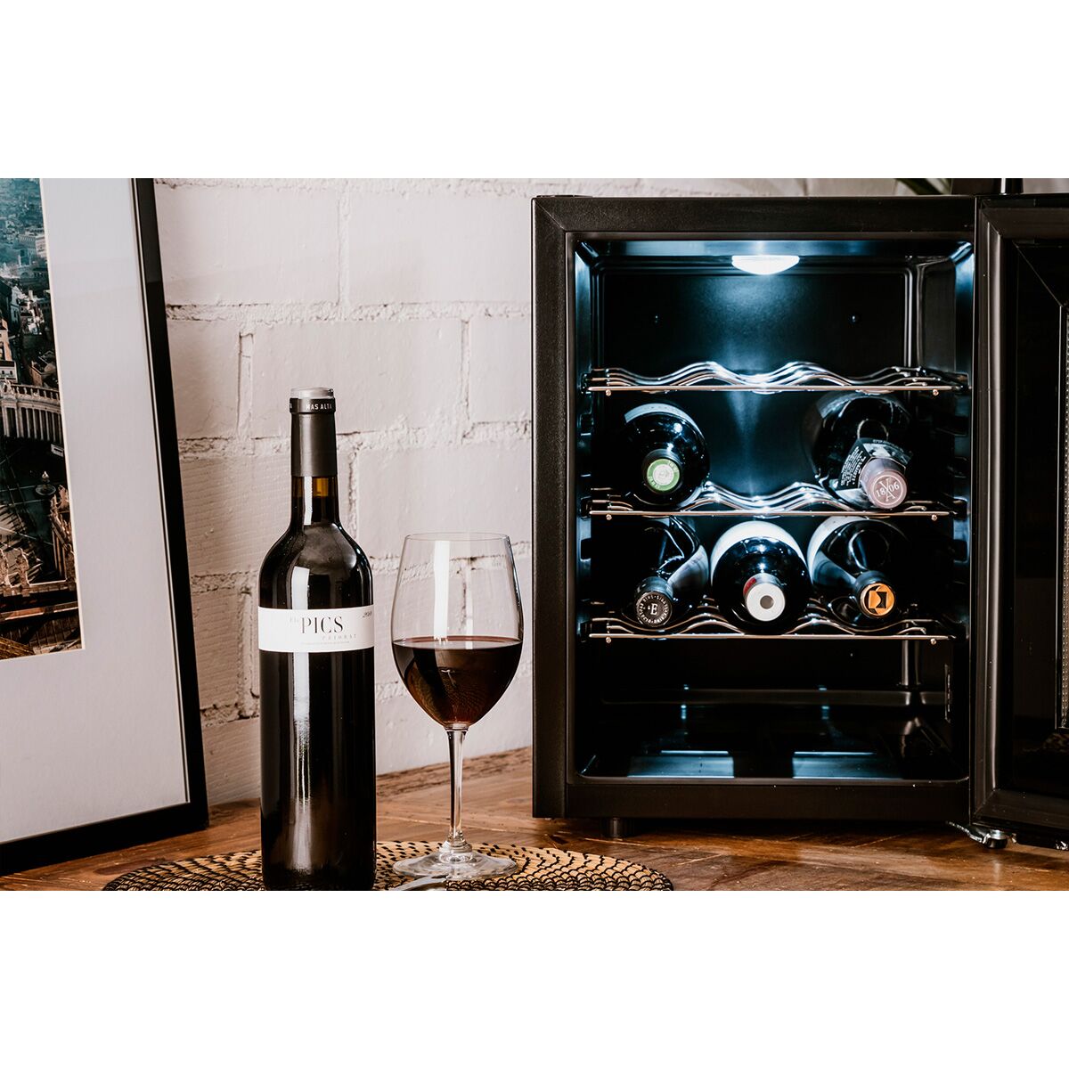Термоэлектрический 1 температурная зона (11-18°C) Вместимость 12 бутылок Цифровой Экран Подсветка камеры Нескользящие ножки Очень тихий, 26 дБ Размеры: 345 х 490 х 470 мм Система охлаждения Термоэлектрический; Возможность встраивания Нет; Серия Chanson; Вместимость 12; Количество камер 1; Температурных зон 1; Диапазон температур 11-18°C при комнатной температуре 20-25°C; Количество полок 3; Объём (л) 31; Перенавешиваемая дверь ; Замок двери Нет; УФ-фильтр Да; Угольный фильтр Нет; Подсветка Да; Цвет корпуса Чёрный; Цвет дверцы Чёрный; Энергетический класс ; Климатический класс ; Уровень шума (дБ) 26; Габариты прибора (ШхВхГ) ; Габариты упаковки (ШхВхГ) ; Напряжение (В) 220-240; Мощность (Вт) 70; Годовое энергопотребление (кВт*ч) 129