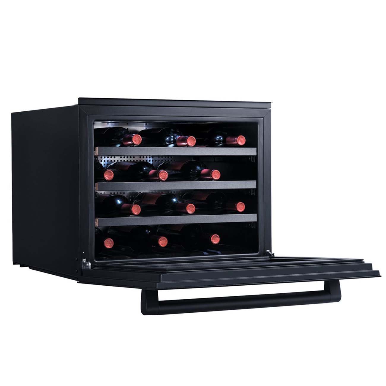 Тип устройства: Тип: винный шкаф: Тип винного шкафа: температурный: Охлаждение: Тип охлаждения: компрессорный: Хладагент: R 600a: Климатический класс: N-ST: Объем: Общий объем: 55 л: Корпус: Количество камер: 1: Количество полок: 3: Винное отделение: Максимальное количество бутылок: 24: Кол-во температурных зон: 1: Материал бортика: сталь: Уровень шума: Максимальный уровень шума: 38 дБ: Энергоэффективность: Класс энергоэффективности: G: Энергопотребление в год: 138 кВтч: Управление: Тип управления: сенсорный: Освещение: Освещение холодильной камеры: Да: Тип освещения: светодиодное: Оснащение: Вентилятор для распределения температуры: Да: Функции: Размораживание холодильной камеры: не требуется: Фильтр: Угольный фильтр: Да: Экран: Тип дисплея: сенсорный: Индикация: Индикация температуры в холодильной камере: Да: Компрессор: Тип компрессора: инверторный: Материал: Материал полок: бук: Дверь: Внешнее покрытие двери: стекло: Цвет: Цвет: черный: Габаритные размеры: Высота: 44.8 см: Ширина: 59.5 см: Глубина: 56.6 с