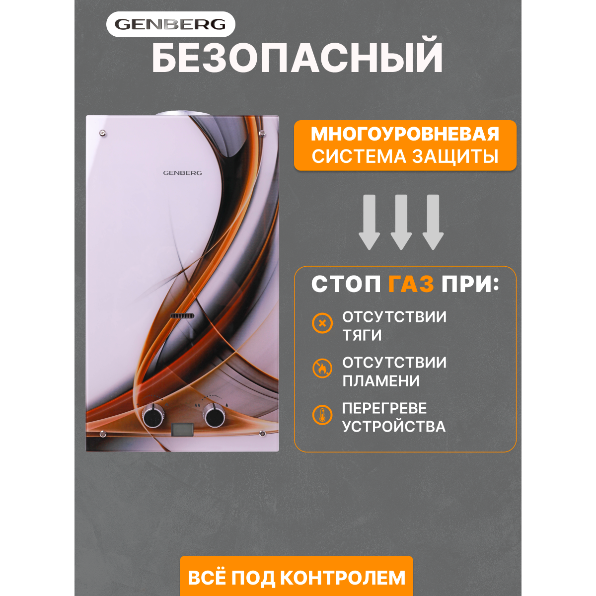 Среди большого количества удобных, надежных и практичных аналогов человек при покупке, в конечном итоге, отдает предпочтение устройству, которое ему больше понравилось своим внешним видом. Эстетическая сторона, при создании газовых водонагревателей GENBERG серии «ДЕКОР», является важнейшим фактором наряду с качеством и надежностью конструкции устройства.: Надежный медный теплообменник гарантирует бесперебойное использование водонагревателя в течение всего срока эксплуатации. Максимальная мощность нагрева составляет 20кВт, а производительность 10 литров в минуту.: Безопасность эксплуатации обеспечивает многоступенчатая система защиты. Она срабатывает и отключает подачу газа при отсутствии тяги, пламени и при перегреве устройства.: Возможен перевод водонагревателя на сжиженный тип газа.: Характеристики: Номинальная мощность, кВт 20: Коэффициент полезного действия, % 88: Расход воды при нагреве на 25°С, л/мин 10: Минимальный проток воды для работы, л/мин 0,13: Количество точек водоразбора 1: Вертикальный монтаж