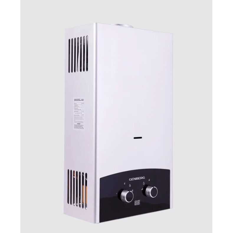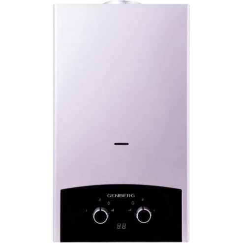 Прекрасным сочетанием функциональности, удобства и внешнего вида является водонагреватель GENBERG серии «Премиум». Теплообменник изготовлен из высококачественной меди, что увеличивает срок эксплуатации. Максимальная мощность нагрева 20кВт, производительность 10 литров в минуту.: Безопасность эксплуатации обеспечивает многоступенчатая система защиты. Она срабатывает и отключает подачу газа при отсутствии тяги, пламени и при перегреве устройства.: Возможен перевод водонагревателя на сжиженный тип газа.: Характеристики: Номинальная мощность, кВт 20: Коэффициент полезного действия, % 88: Расход воды при нагреве на 25°С, л/мин 10: Минимальный проток воды для работы, л/мин 0,13: Количество точек водоразбора 1-2: Вертикальный монтаж на стену с нижней подводкой: Размеры (ШxВxГ) 340x590x180 мм: Электронное зажигание: Цифровой дисплей;