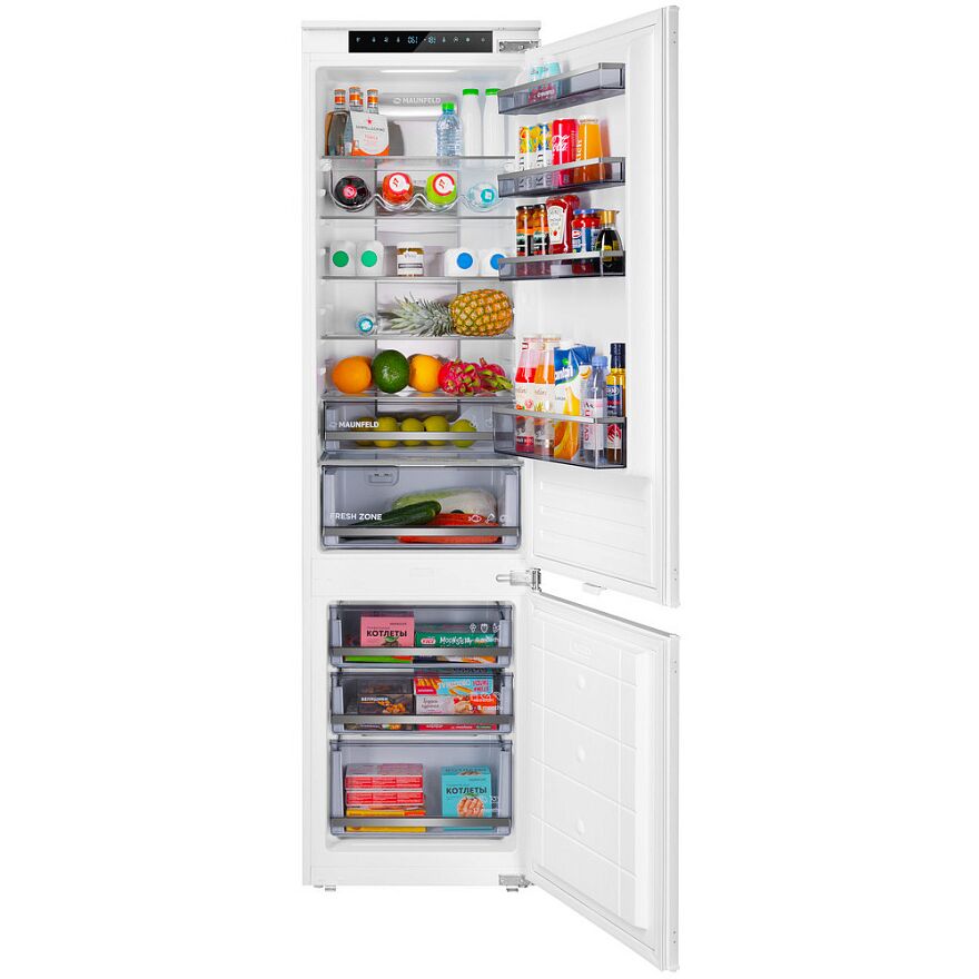 ОСНОВНЫЕ ХАРАКТЕРИСТИКИ: Тип установки: встраиваемый: Количество камер: 2: Количество дверей: 2: Класс энергопотребления: A+: Высота, см: 193.7: Ширина, см: 54: Глубина, см: 55: ОБЪЕМЫ: Общий объем, л: 275: Полезный объем, л: 273: Общий объем холодильного отделения, л: 179: Общий объем морозильного отделения, л: 66: ДИЗАЙН И КОНСТРУКЦИЯ: Цвет: белый: Компрессор: Инверторный: Материал фасада: эмаль: Внутренняя подсветка: светодиодное освещение: Дверной упор: справа: Возможность перевешивания дверей: есть: РЕЖИМЫ И ФУНКЦИИ: Система NoFrost: в морозильном отделении: в холодильном отделении: Суперохлаждение: есть: Суперзаморозка: есть: Функция «Отпуск»: есть: УПРАВЛЕНИЕ: Тип управления: электронное: Переключатели: сенсорные: Дисплей: есть: Индикация открытой двери: звуковая: ХОЛОДИЛЬНОЕ ОТДЕЛЕНИЕ: Система охлаждения холодильника: No Frost: Зона свежести: есть: Количество полок в холодильном отделении: 6: Материал полок: закаленное стекло: Количество ящиков для овощей и фруктов: 2: Количество полок на двери: 4: Де