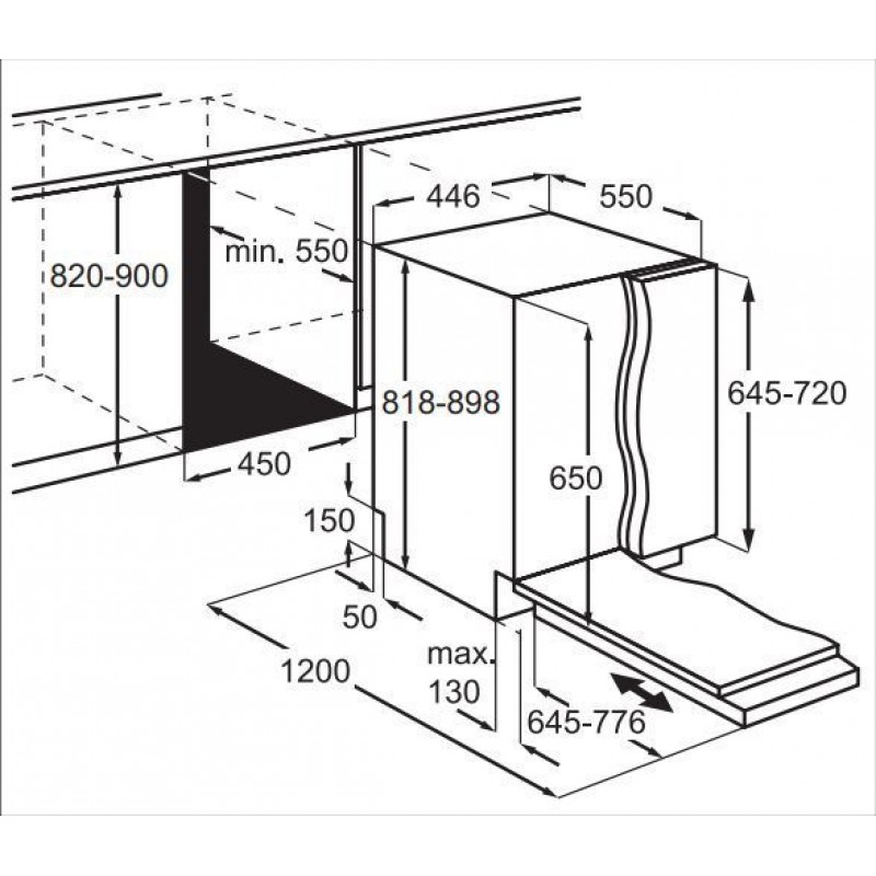ОСНОВНЫЕ ХАРАКТЕРИСТИКИ: Тип: узкая: Установка: встраиваемая: Высота, см: 81.8: Ширина, см: 44.6: Глубина, см: 55: Размеры ниши, см: 82-90 х 45 х 55: Вместимость комплектов: 10: Класс энергопотребления: B (новое обозначение – E): Класс мойки: A: Класс сушки: A: ФУНКЦИОНАЛ: Количество программ: 6: Количество температурных режимов: 2: Быстрая: 30 мин., 50°C: Экономичная: 50°C: Стандартная: 90 мин. / 60°C: AUTO Sense: 120-170 мин. / 50-60°C: Предварительное ополаскивание: Есть: Самоочистка: Есть: Сушка посуды: AirDry Technology: УПРАВЛЕНИЕ И ДИЗАЙН: Управление: сенсорное: Индикация: дисплей: «Луч на полу»: двухцветный: Индикаторы: наличие соли и ополаскивателя: выбранная программа: оставшееся время: отложенный старт: Таймер отсрочки запуска: до 3 ч.: Датчик прозрачности воды: Да: Звуковой сигнал в конце цикла: Да: БЕЗОПАСНОСТЬ: Автоматическое отключение: Да: Защита от протечек: Есть: КОНСТРУКЦИЯ И КОМПЛЕКТАЦИЯ: Нижний распылитель: стандартный: Регулируемая верхняя корзина, также с полной загрузкой: Да: Лоток для