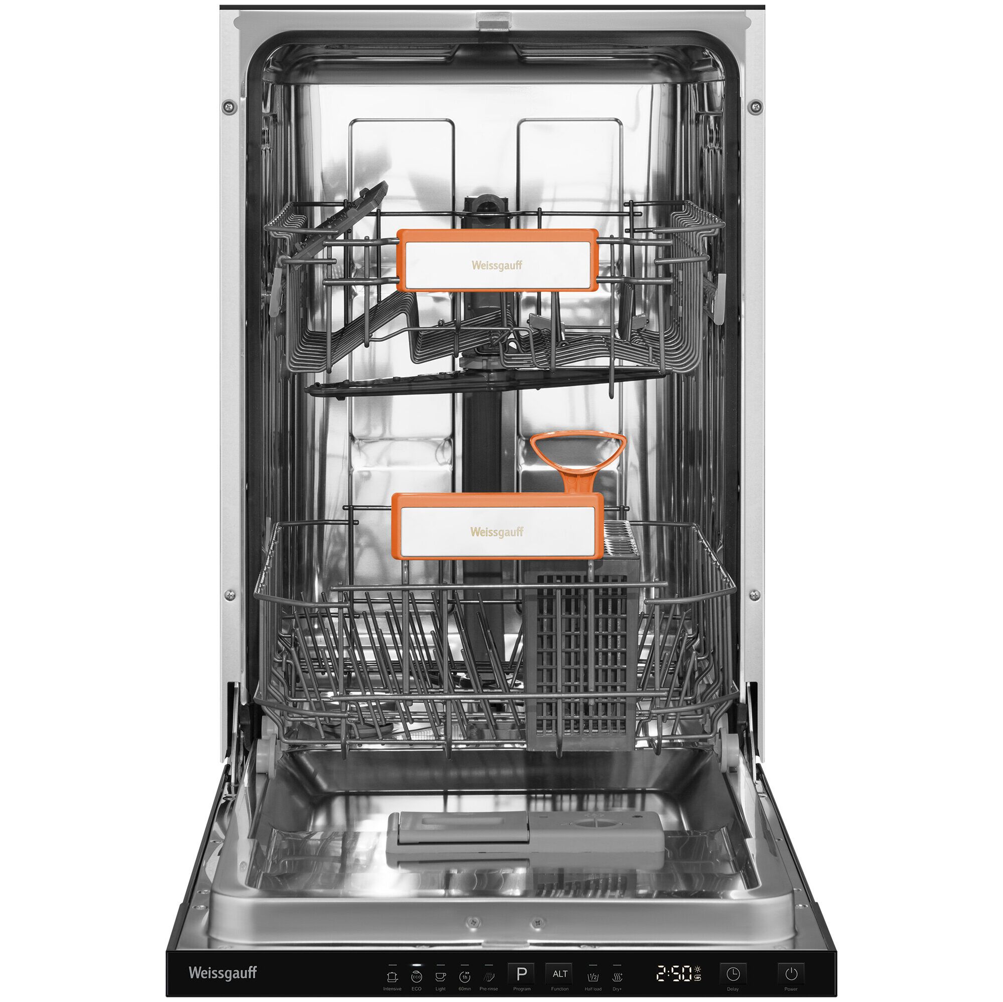 Общие характеристики : Weissgauff : Цвет : черный : Вместимость : 9 комплектов : Тип : узкая : Тип установки : встраиваемая полностью : Класс энергопотребления : A++ : Класс мойки : A : Класс сушки : A : Управление : электронное : 3-й разбрызгиватель : нет : Высота : 82 см : Ширина : 45 см : Глубина : 55 см : Вес : 32.3 кг : Расход воды : 10 л : Энергопотребление за цикл : 0.7 кВт·ч : Уровень шума при работе : 49 дБ : Программы и режимы мойки : Программы : быстрая, интенсивная, предварительное ополаскивание/замачивание, стандартная, экономичная : Количество программ мойки : 5 : Тип сушки : конденсационная : Время мойки при обычной программе : 170 мин : Особенности : Особенности конструкции : внутренняя поверхность из нержавеющей стали, дисплей, регулируемая по высоте корзина для посуды, таймер отсрочки : Минимальное время отсрочки запуска : 1 ч : Максимальное время отсрочки запуска : 24 ч : Индикация работы : луч на полу : Индикаторы наличия средств : наличия ополаскивателя, наличия соли : Безопасность : защи