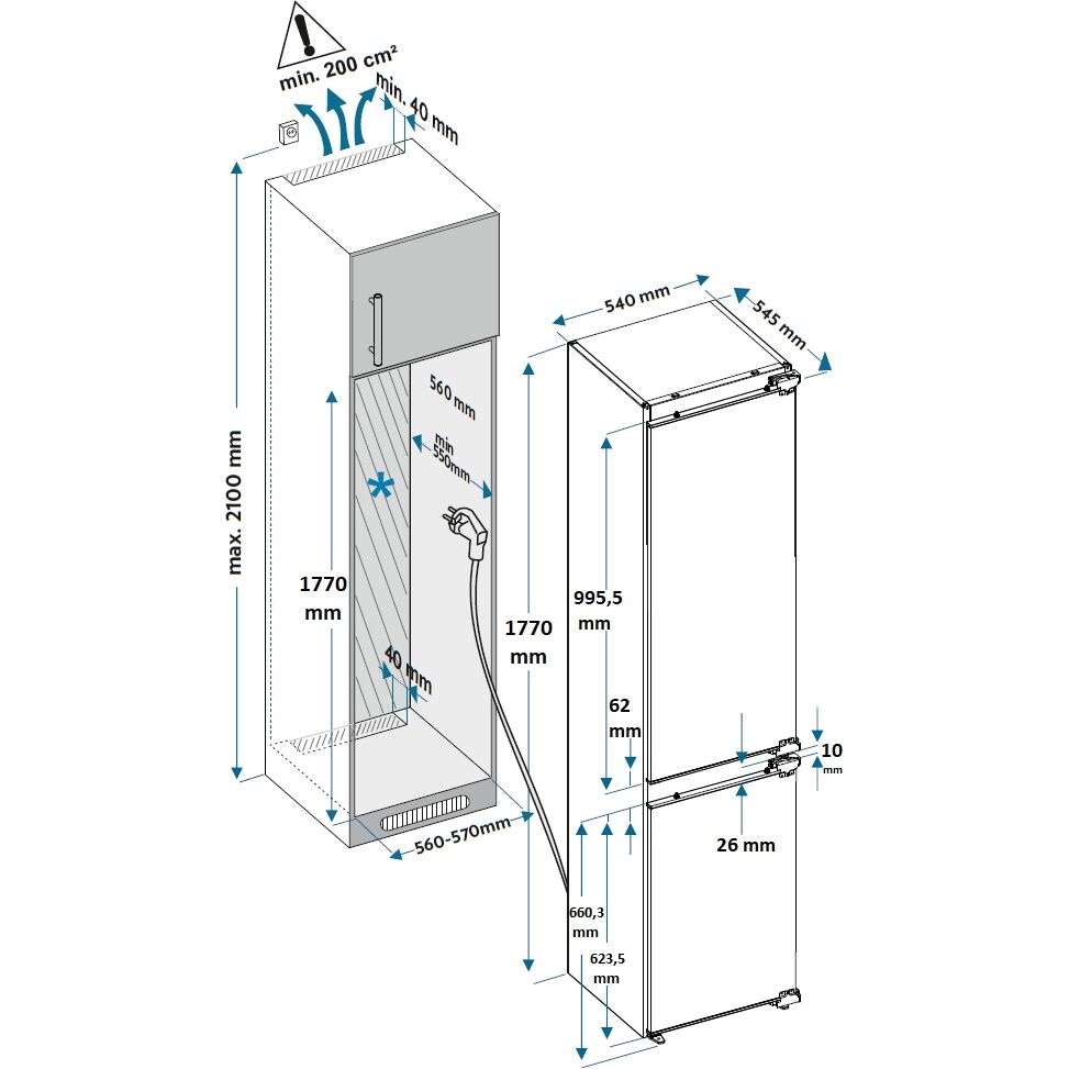 Основные характеристики : Тип Холодильник : Тип встраивания полновстраиваемый : Класс энергопотребления A+ : Климатический класс T/N : Количество компрессоров 1 : Мощность замораживания 3 кг/сут : Уровень шума 41 дБ : Тип размораживания холодильной камеры Frost Free : Тип размораживания морозильной камеры No Frost : Хладагент R600a : Потребление энергии (кВт*ч/год) 287 : Функции : Суперзаморозка ДА : Технические характеристики : Общий объем холодильника 243 л : Общий объем холодильной камеры 180 л : Общий объем морозильной камеры 63 л : Полезный объем холодильника 243 л : Полезный объем холодильной камеры 180 л : Полезный объем морозильной камеры 63 л : Оснащение : Расположение морозильной камеры снизу : Количество камер двухкамерный : Количество полок в холодильной камере 3 : Количество ящиков в холодильной камере 1 : Количество ящиков в морозильной камере 3 : Материал полок закаленное стекло : Особенности : Перевешиваемые двери ДА : Хранение при отключении питания 12 ч : Дополнительно Полка для вина : Корпу