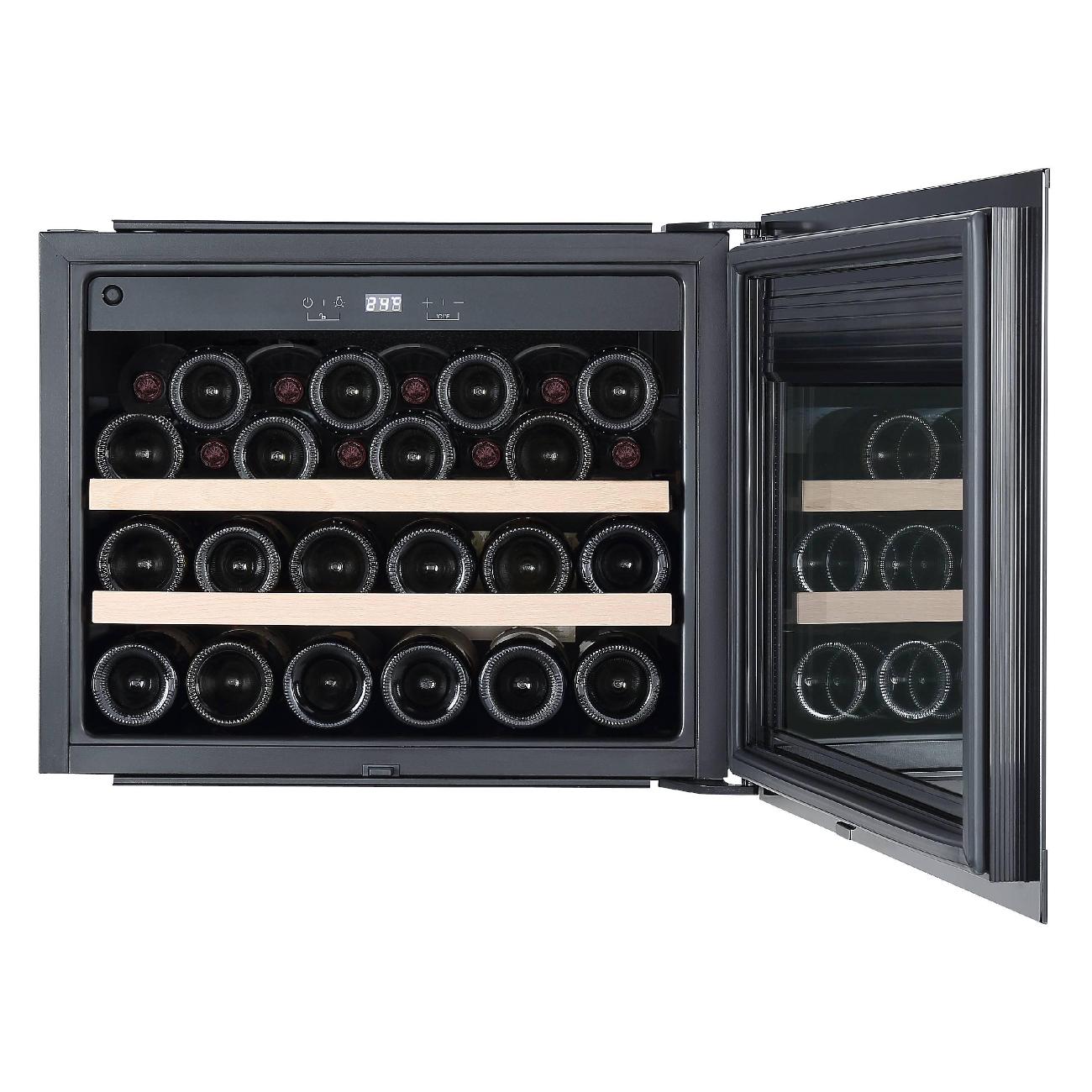 Общие характеристики: Цвет товара: черный: Тип винного шкафа: монотемпературный: Класс энергопотребления: A: Климатический класс: N, SN, ST: Количество компрессоров: 1: Дополнительные функции: защита от детей, индикация температуры: Стеклянные двери: да: Материал полок: дерево: Камеры: Количество камер: 1: Количество дверей: 1: Габариты и вес: Вес: 26.6 кг: Высота: 45.5 см: Ширина: 59 см: Глубина: 56.3 см: Объем: Общий объем: 62 л: Емкость винного шкафа, бут.: 28: Дополнительно: Уровень шума: 40 дБ: Хладагент: R600a (изобутан);;
