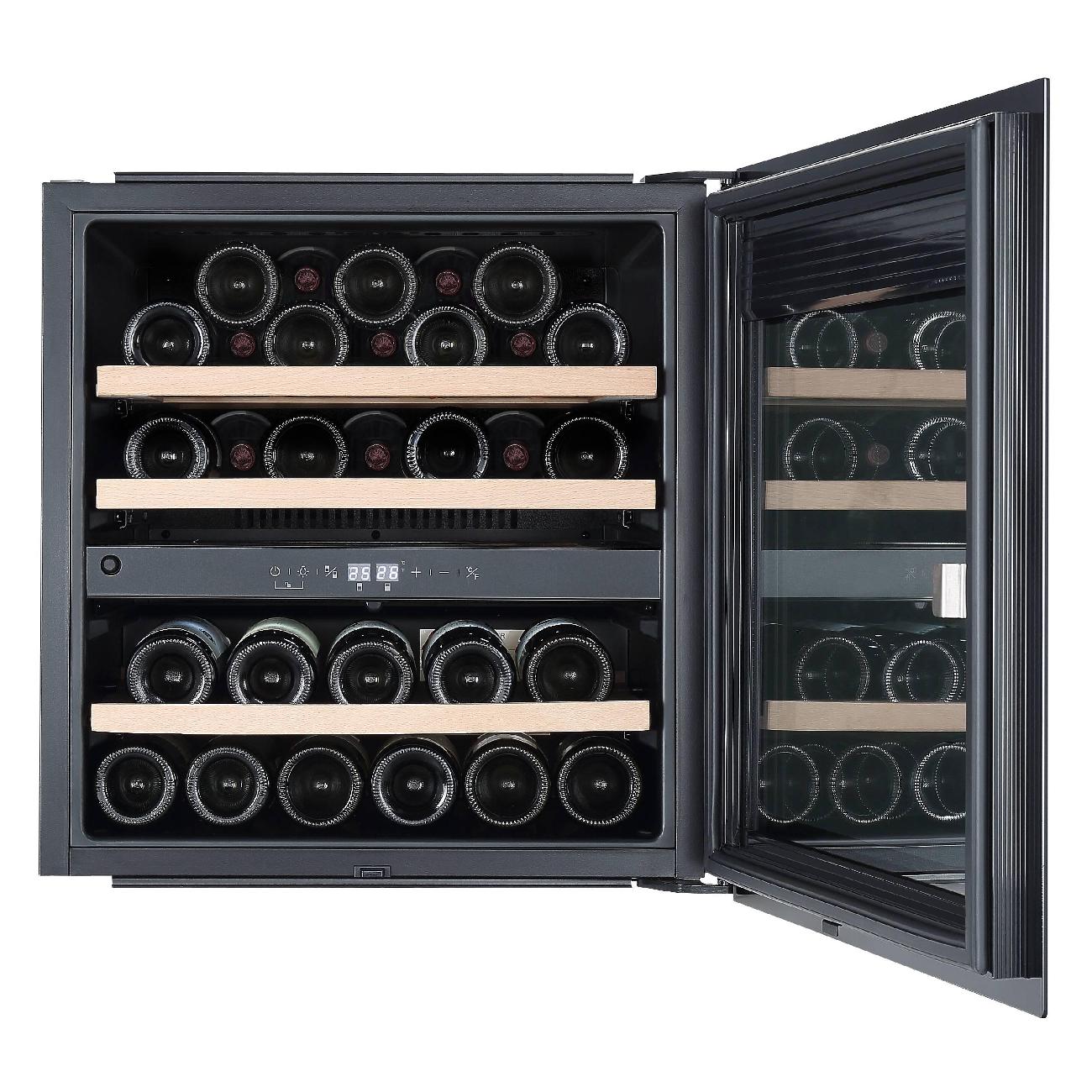 Общие характеристики: Цвет товара: черный: Тип винного шкафа: двухтемпературный: Класс энергопотребления: A: Климатический класс: N, SN, ST: Количество компрессоров: 1: Дополнительные функции: защита от детей, индикация температуры: Стеклянные двери: да: Материал полок: дерево: Камеры: Количество камер: 1: Количество дверей: 1: Габариты и вес: Вес: 33.2 кг: Высота: 59.5 см: Ширина: 59 см: Глубина: 56.3 см: Объем: Общий объем: 85 л: Емкость винного шкафа, бут.: 30: Дополнительно: Уровень шума: 41 дБ: Хладагент: R600a (изобутан);;