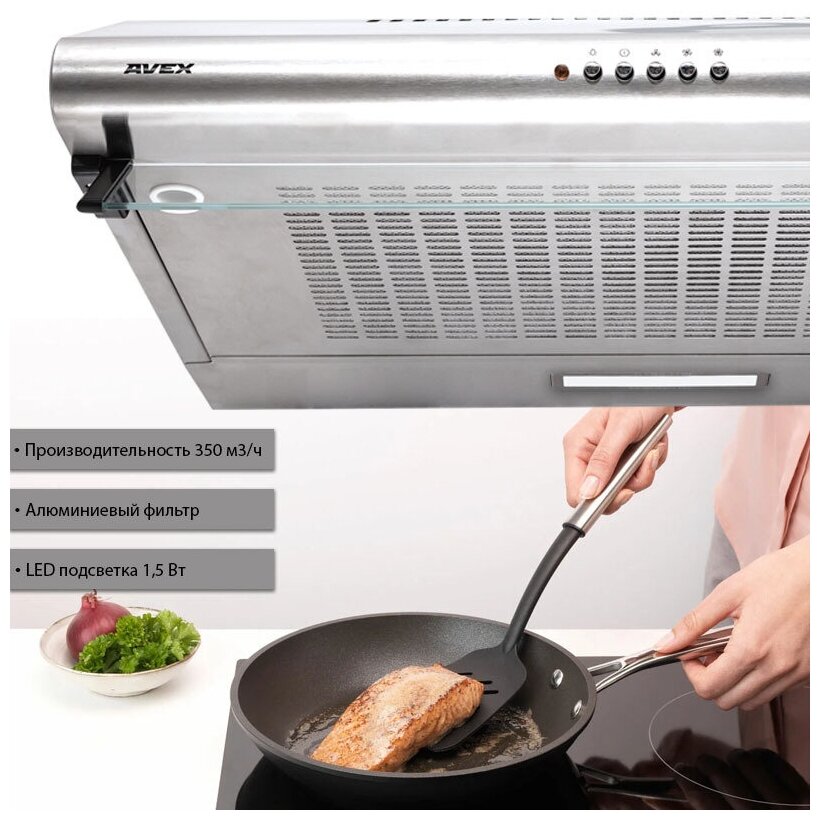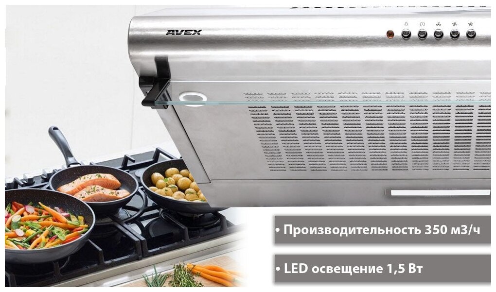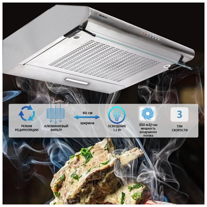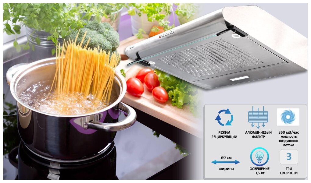 форм-фактор: плоская, ширина: 60 см, глубина: 50 см, режимы работы: отвод / циркуляция, максимальная производительность: 350 м³/час, тип установки: пристенная, фильтр: жировой, тип управления: механическое, тип освещения: светодиодная лампа, максимальный уровень шума: 52 дБ, ширина встраивания: 60 см, диаметр патрубка воздуховода: 120 мм, мощность двигателя: 125 Вт, потребляемая мощность: 125 Вт, дополнительные функции: интенсивный режим, особенности конструкции: антивозвратный клапан