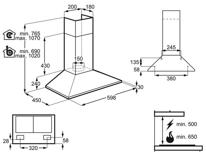 монтируется к стене; отвод / циркуляция; макс. производительность 420 куб. м/ч; ширина для установки 60 см