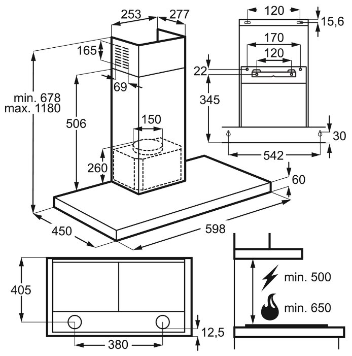 монтируется к стене; отвод / циркуляция; макс. производительность 600 куб. м/ч; ширина для установки 60 см; мощность двигателя 210 Вт