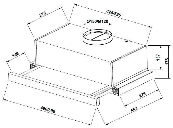 выдвижная, встраивается в навесной шкафчик; отвод / циркуляция; макс. производительность 550 куб. м/ч; ширина для установки 50 см; мощность 126 Вт; мощность двигателя 120 Вт; механическое управление