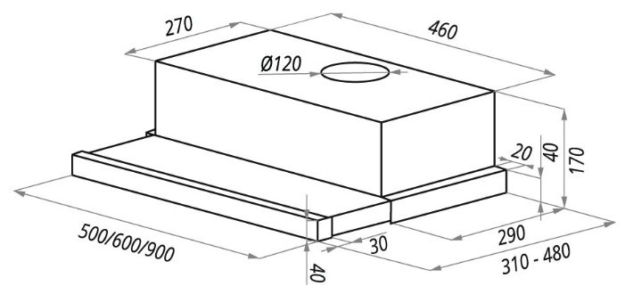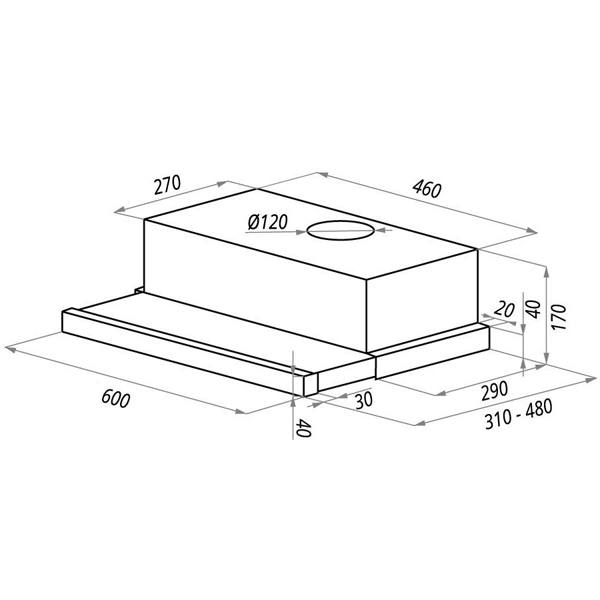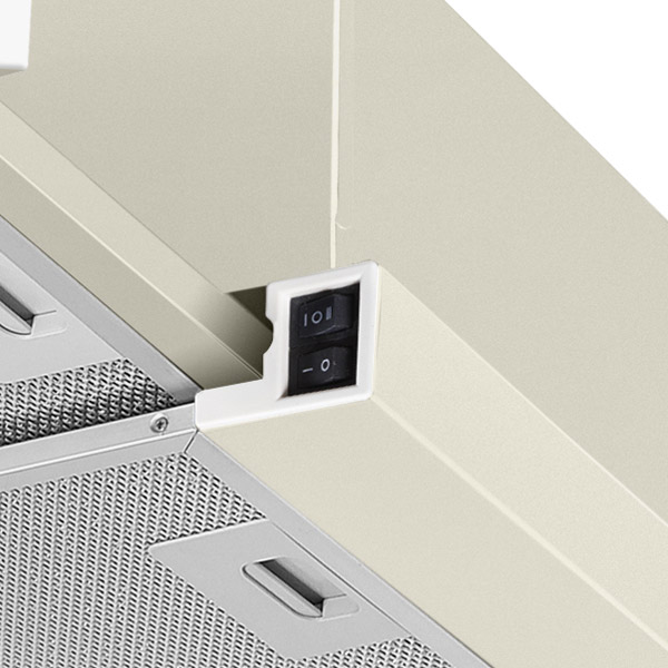 выдвижная, встраивается в навесной шкафчик; отвод / циркуляция; макс. производительность 520 куб. м/ч; ширина для установки 60 см; мощность 140 Вт; механическое управление; тихий двигатель