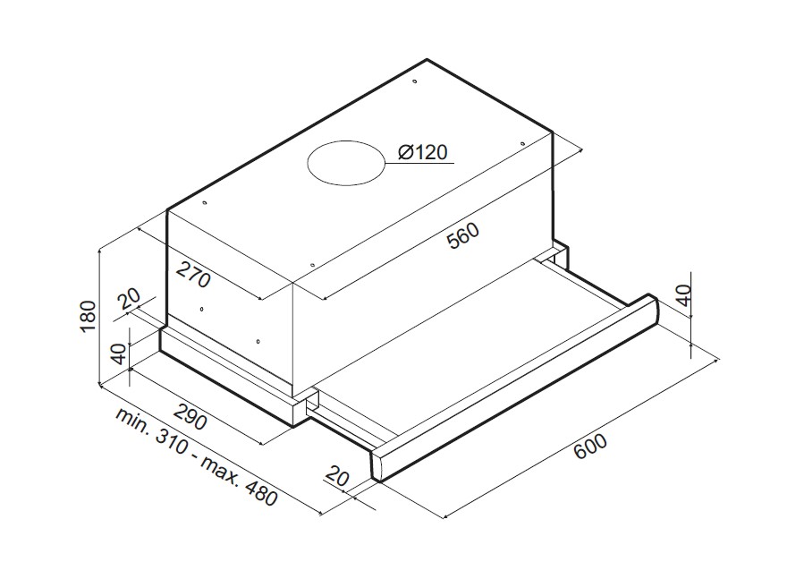 встраивается в навесной шкафчик; отвод / циркуляция; макс. производительность 620 куб. м/ч; ширина для установки 60 см; мощность 130 Вт; механическое управление; тихий двигатель
