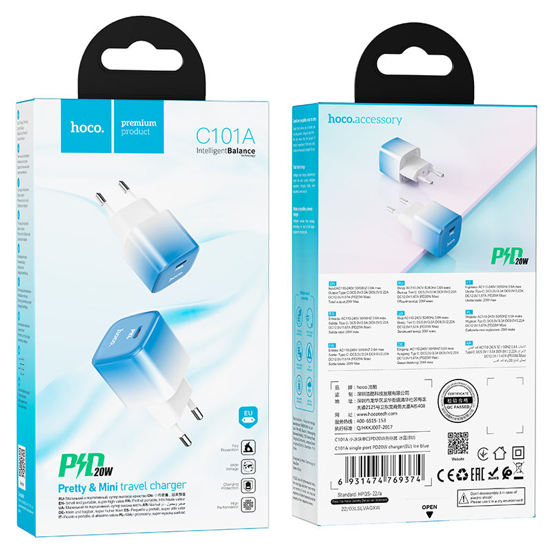 Зарядное устройство от сети 220в Hoco C101A PD20W синий